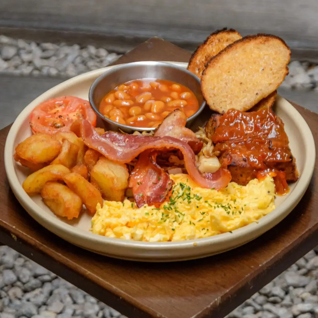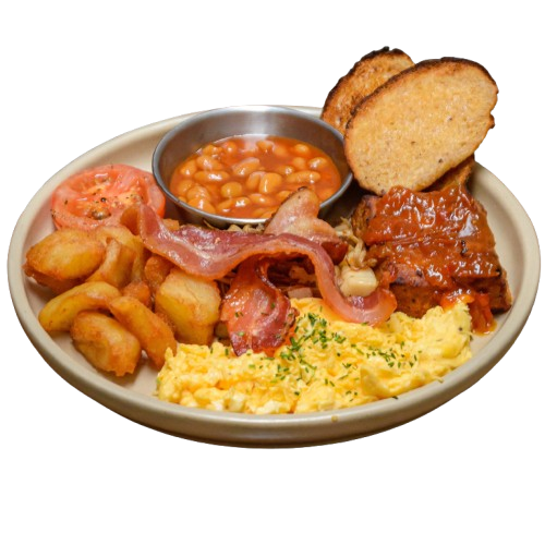 Buttered artisan toast, two eggs of your way, spiced sausage loaves, tomato chilli jam, bacon rashers, mushroom medley, potato croquettes, roasted tomato, baked beans