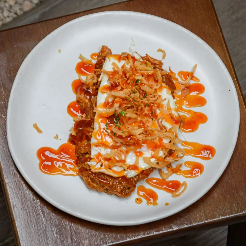 Slaw, fried eggs, crispy onions