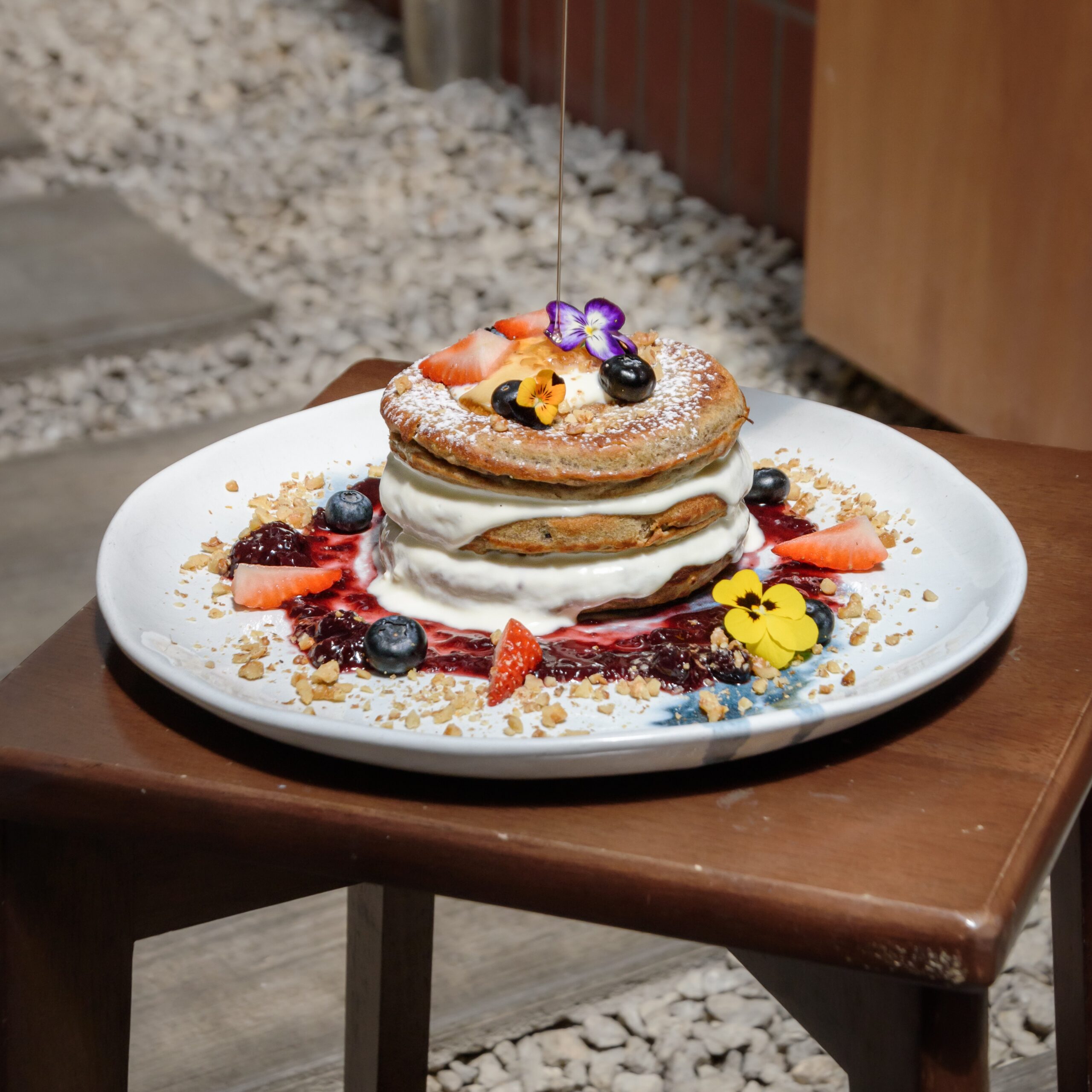 oat milk banana pancakes, blueberry compote, coconut yoghurt, walnut crumbs, berries, honey